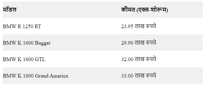 बीएमडब्ल्यू मोटरराडच्या लेटेस्ट उत्पादनांच्या एक्स शोरुमच्या किंमतींची माहिती खाली दिलेल्या तक्त्यात दिली आहे.