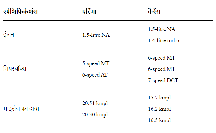 मारुती सुझुकी एर्टिगा आणि Kia Carense च्या मायलेजची माहिती वरील टेबलमध्ये इंजिन आणि गिअरबॉक्सनुसार दिली आहे. येथे हे लक्षात घेण्यासारखे आहे की Ertiga CNG आणि Karens डिझेल व्हेरियंटमध्ये देखील उपलब्ध आहे परंतु हे तुलनेत समाविष्ट केले गेले नाही.