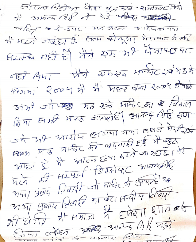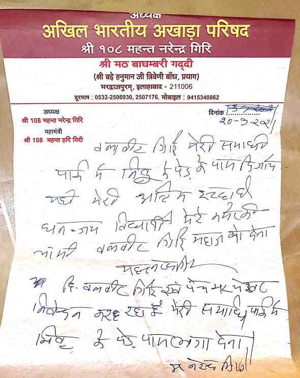 अखिल भारतीय अखाडा परिषदचे अध्यक्ष महंत नरेंद्र गिरी प्रकरणातील सुसाईड नोटसुद्धा हाती लागली आहे. मिळालेल्या माहितीनुसार, या नोटमध्ये त्यांनी आत्महत्येला शिष्य आनंद गिरी, आघा तिवारी आणि एकाला जबाबदार धरले आहे. तसेच, मागील आठवड्यातसुद्धा त्यांनी आत्महत्या करण्याचा प्रयत्न केला असल्याची माहिती समोर येत आहे. शिवाय मरणानंतर आपल्या उत्तराधिकाऱ्याची देखील नोंद सुसाईड नोटमध्ये केली आहे. (Mahant Narendra Giri suicide note)