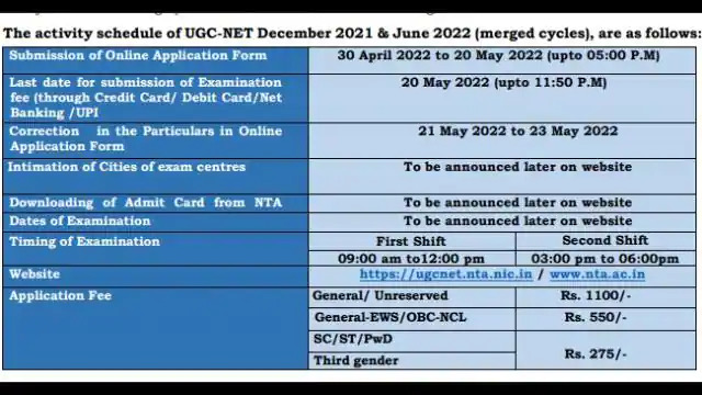युजीसी नेट परीक्षेची तारीख अद्याप जाहीर करण्यात आलेली नसून सकाळी 9 ते दुपारी 12 आणि दुपारी 3 ते 6 अशा दोन शिफ्टमध्ये ही परीक्षा होणार आहे. अर्ज प्रक्रिया पूर्ण झाल्यानंतर यूजीसी नेट २०२२ ची तारीख जाहीर करता येईल. पुढे पाहा यूजीसी नेट अर्ज प्रक्रियेशी संबंधित ठळक मुद्दे :