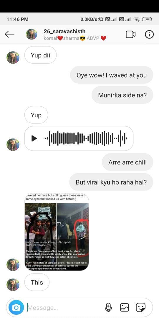 त्यानंतर JNU आणि दिल्ली विद्यापीठातील अनेक मित्र मत्रिणींनी ‘त्या’ मुलीच्या पेहरावावरून आणि तिचा देहबोलीवरून ती दिल्ली विद्यापीठातील विद्यार्थिनी कोमल शर्मा असल्याचं म्हटलं आणि ती राष्ट्रीय स्वयंसेवक संघाशी संलग्न ABVP’ संघटनेची सक्रिय कार्यकर्ती असल्याचं देखील म्हटलं आहे. यावरून विद्यापीठातील मित्र-मैत्रीणमध्येच चर्चा सुरु झाली होती आणि त्यातील एका संवादात कोमल शर्मा पकडली देखील गेली आहे असं म्हणता येईल.