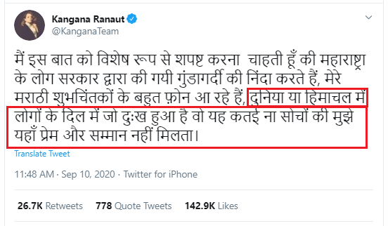 महाराष्ट्र सरकार ने हिमाचल की बेटी कंगना रणौत के साथ जो राजनीतिक प्रतिशोध की भावना से अत्याचार किया है यह अत्यंत चिंताजनक एवं निंदनीय है।