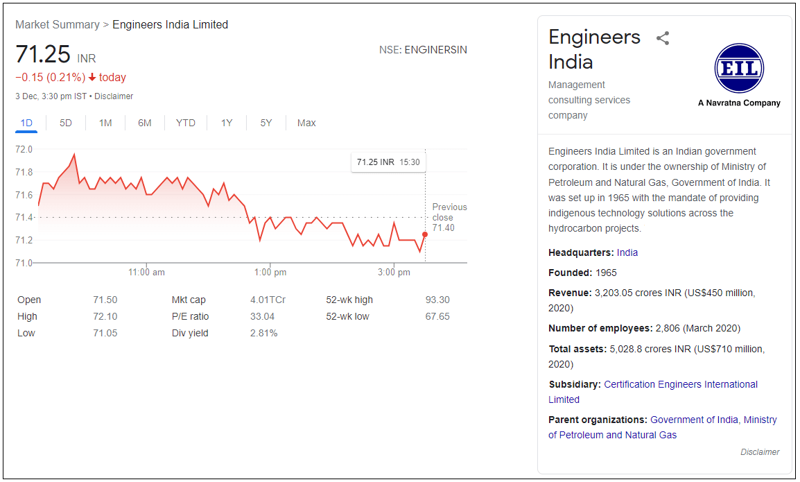 ब्रोकरेज फर्म म्हणते की इंजिनियर्स इंडिया (EIL) ची Q2FY22 कामगिरी खराब आहे. हे प्रामुख्याने सल्लागार आणि टर्नकी विभागातील खराब अंमलबजावणीमुळे होते. तथापि, कंपनीला या तिमाहीत चेन्नई पेट्रोलियम कॉर्पोरेशन लिमिटेड (CPCL), नागापट्टणम कडून दोन प्रमुख ऑर्डर प्राप्त झाल्या आहेत. सुमारे 1170 कोटी रुपयांची ही ऑर्डर आहे. कंपनीची ऑर्डर बुक मजबूत झाली आहे आणि दृष्टीकोन अधिक चांगला दिसत आहे.