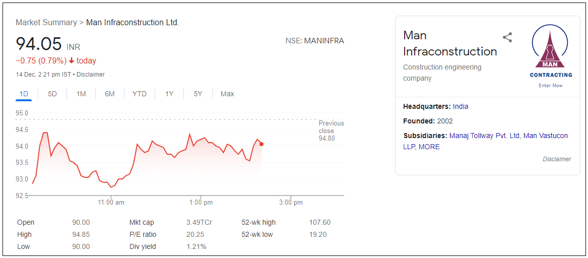 बांधकाम अभियांत्रिकी कंपनी मॅन इन्फ्राकन्स्ट्रक्शनचा हिस्सा या वर्षी गुंतवणूकदारांसाठी मल्टीबॅगर ठरला आहे. गेल्या एका वर्षात या शेअर्सने गुंतवणूकदारांना 330 टक्के उत्कृष्ट परतावा दिला आहे. गेल्या एका वर्षात आतापर्यंत शेअरची किंमत रु. 22 (14 डिसेंबर 2020) वरून रु. 95 (13 डिसेंबर 2021) पर्यंत वाढली आहे.