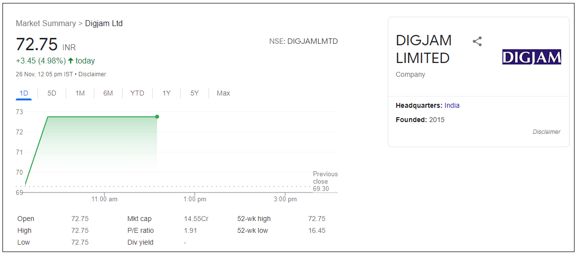 डिगजॅम लिमिटेडच्या शेअर्समधून 1 महिन्यात 174.68% परतावा: