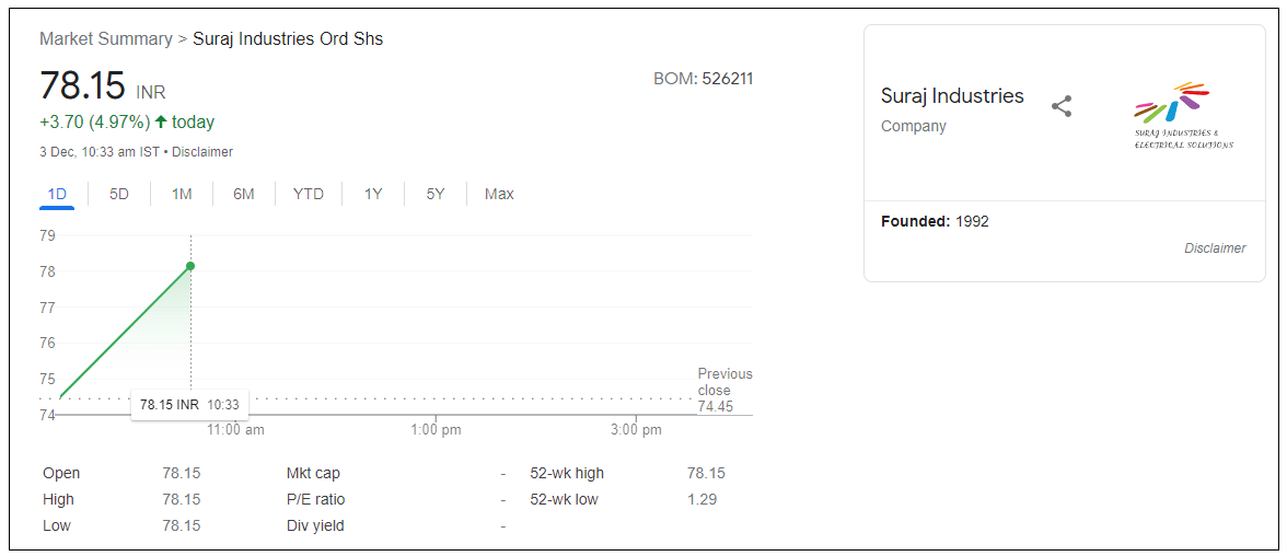 6 महिन्यांत 2 रुपयांचा स्टॉक 74 रुपयांवर वर वाढला – Suraj Industries Ltd Share Price