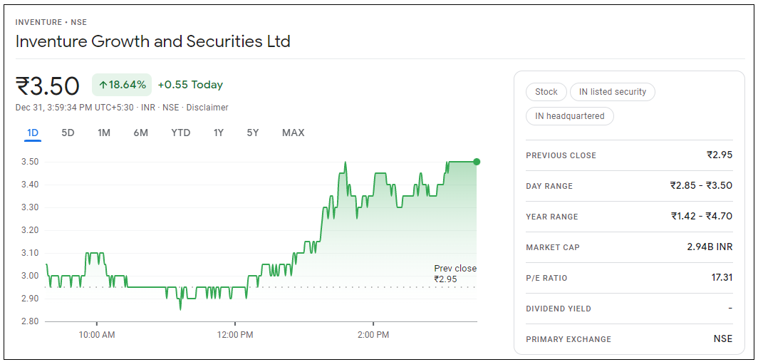 Penny Stock Return on Inventure Growth and Securities Ltd that gained more than 18 per cent on a closing basis on Friday, December 31, 2021 :