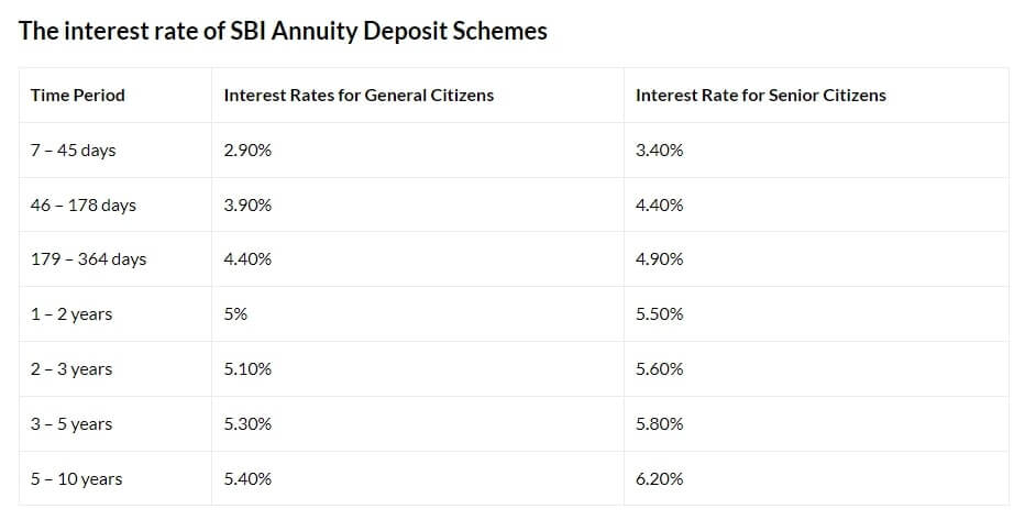 एसबीआयच्या या योजनेतील वार्षिकी पुढील महिन्यात ठेवीच्या नियोजित तारखेपासून भरली जाईल. जर एखाद्या महिन्याची ती तारीख (29, 30 आणि 31) नसेल तर पुढील महिन्याच्या 1 तारखेला अॅन्युइटी दिली जाईल. वार्षिकी देयक टीडीएसमधून कापले जाईल आणि लिंक्ड बचत खाते किंवा चालू खात्यात जमा केले जाईल. एसबीआय अॅन्युइटी डिपॉझिट स्कीममध्ये सामान्य ग्राहक आणि ज्येष्ठ नागरिकांना मुदत ठेवींवर व्याज मिळते. यात वैयक्तिक नामांकनाची सुविधा आहे. युनिव्हर्सल पासबुकही ग्राहकांना देण्यात येणार आहे. योजनेचे खाते बँकेच्या एका शाखेतून दुसर् या शाखेत हस्तांतरित केले जाऊ शकते.