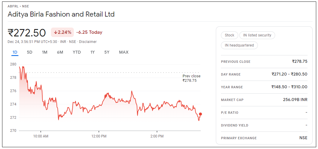 आदित्य बिर्ला फॅशन अँड रिटेल लिमिटेड ही 2007 मध्ये स्थापन झालेली रिटेल क्षेत्रात कार्यरत असलेली लार्ज कॅप कंपनी असून या कंपनीचे रु. 25379.94 कोटी इतके मार्केट कॅप आहे.