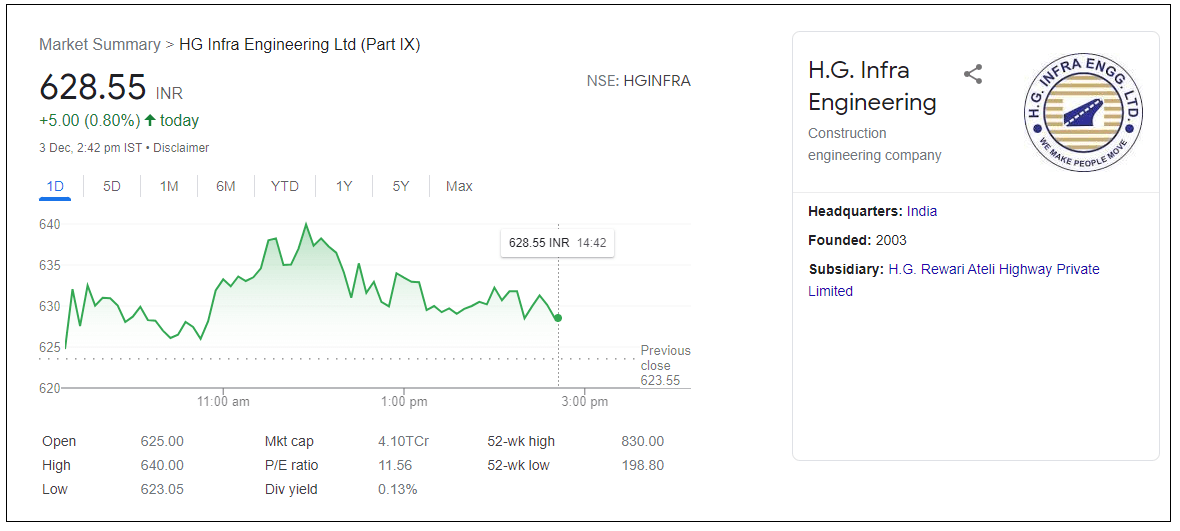 मुंबई, 03 डिसेंबर | एमके ग्लोबलने मल्टीबॅगर स्टॉक एचजी इन्फ्रा इंजिनियरिंग लिमिटेड वर बाय रेटिंग दिले आहे. ब्रोकरेज हाऊसचा विश्वास आहे की पुढील 12 महिन्यांत या स्टॉकमध्ये 820 रुपयांचे लक्ष्य पाहिले जाऊ शकते. हे लक्षात घेण्यासारखे आहे की 2021 मध्ये आतापर्यंत (Stock with BUY Rating) हा स्टॉक 188 टक्क्यांनी वाढला आहे.