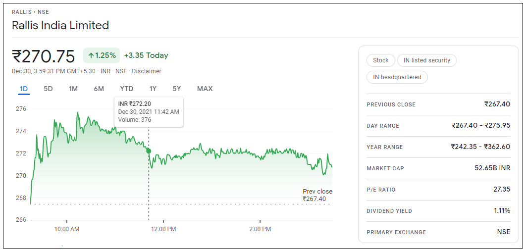 Stock with BUY Rating on Rallis India Ltd with a target price of Rs 350. The current market price of Rallis India Ltd. is Rs 275. Time period given by analyst is one year :