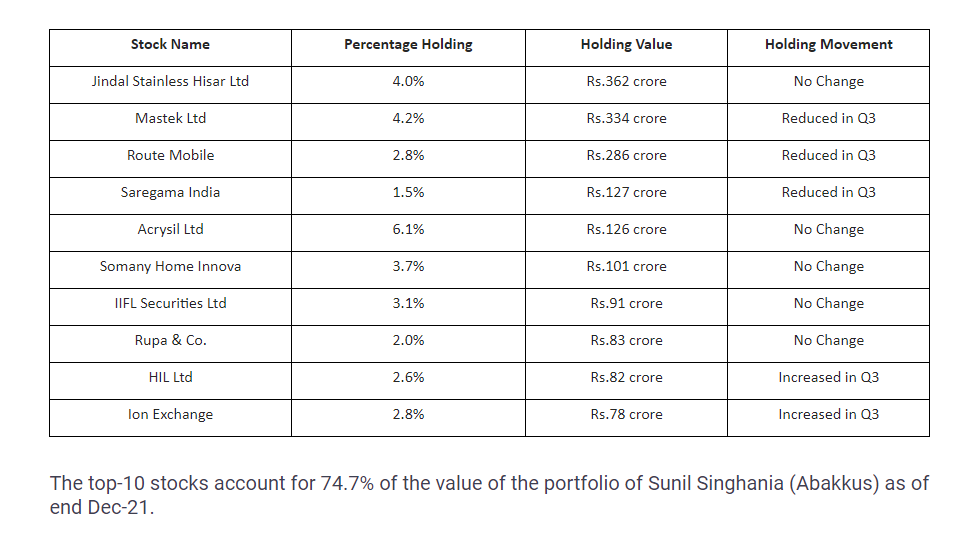 डिसेंबर 2021 च्या अखेरीस, सुनील सिंघानिया (अबक्कूस) यांच्याकडे पोर्टफोलिओमध्ये 30 जानेवारीच्या मूल्यमापनानुसार रु. 2,236 कोटी बाजारमूल्य असलेले 24 स्टॉक होते. बाजारातील एकूण घसरणीच्या अनुषंगाने त्याचा पोर्टफोलिओ डिसेंबर-21 तिमाहीत अनुक्रमे 18% खाली आहे. रुपयाच्या मूल्याच्या बाबतीत त्याच्या सर्वोच्च होल्डिंगचा स्नॅपशॉट येथे आहे.