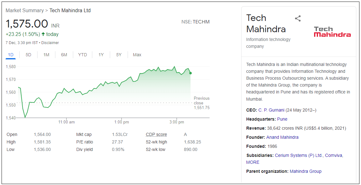 लाइव्हमिंटच्या अहवालानुसार, टेक महिंद्राने गेल्या 5 वर्षांमध्ये 232 टक्के मजबूती नोंदवली आहे, तर NSE निफ्टीने या कालावधीत सुमारे 108 टक्के परतावा दिला आहे. याचा अर्थ टेक महिंद्राने 50-स्टॉक बेंचमार्क निर्देशांकापेक्षा जास्त परतावा दिला आहे. तथापि, शेअर बाजारातील तज्ञ अजूनही याबद्दल उत्साहित आहेत कारण ही एक कर्जमुक्त कंपनी आहे आणि आयटी कंपन्यांनी जागतिक ओमिक्रॉनच्या वाढत्या धोक्यात वाढत्या जागतिक महागाईपासून तटस्थ राहण्याची अपेक्षा आहे.