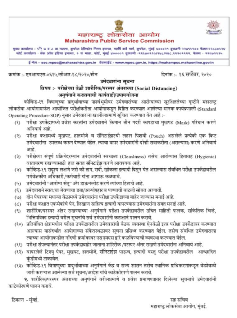 मुंबई, १६ सप्टेंबर : महाराष्ट्र लोकसेवा आयोगाच्यावतीने आयोजित परीक्षांकरिता कोविड-१९ विषाणूच्या प्रादुर्भावाच्या पार्श्वभूमीवर उमेदवारांच्या आरोग्याच्या सुरक्षिततेच्या दृष्टीने काही सूचना तसेच उपाययोजना सांगण्यात आल्या आहेत. यासंबंधी आयोगाकडून परिपत्रक काढण्यात आले असून, उमेदवारांना या सूचनांचे पालन करणे आवश्यक असणार आहे.