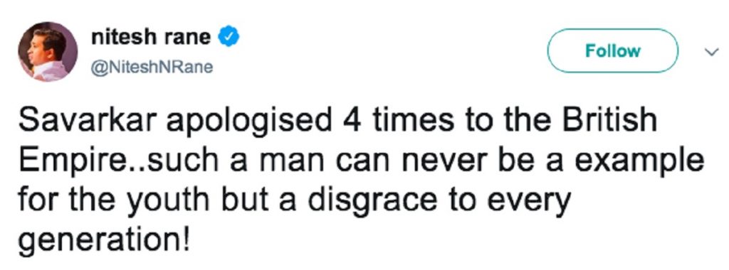 चार वेळा ब्रिटिश सरकारची माफी मागणारे वीर सावरकर हे देशातील तरुणांसाठी आदर्श ठरू शकत नाहीत, असे ट्विट केंद्रीय मंत्री आणि भाजपचे राज्यसभा खासदार नारायण राणे यांचे पुत्र नितेश राणे यांनी २०१५ मध्ये केले होते. त्यावरूनही सुषमा अंधारेंनी हल्लाबोल केला.